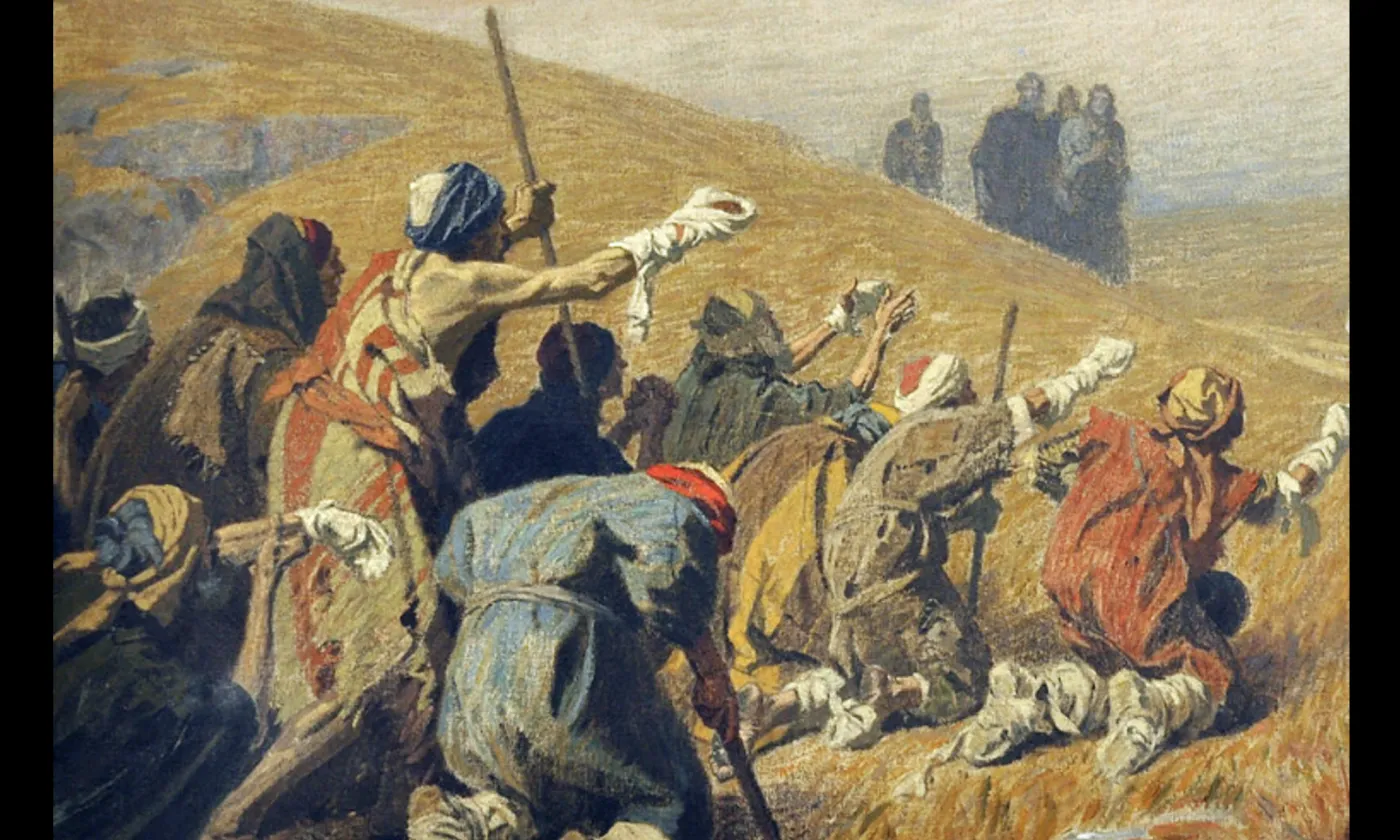 Ces lépreux sont les exclus de la société de l’époque, chassés de leur lieu de vie ils se sont installé à la frontière entre la Galilée et la Samarie. Comme tous les parias ils s’installent dans les zones grises. Grises comme leur peau atteinte par la maladie et grise comme leur statut, ni juifs, ni samaritains mais rassemblés en une communauté du survivre.