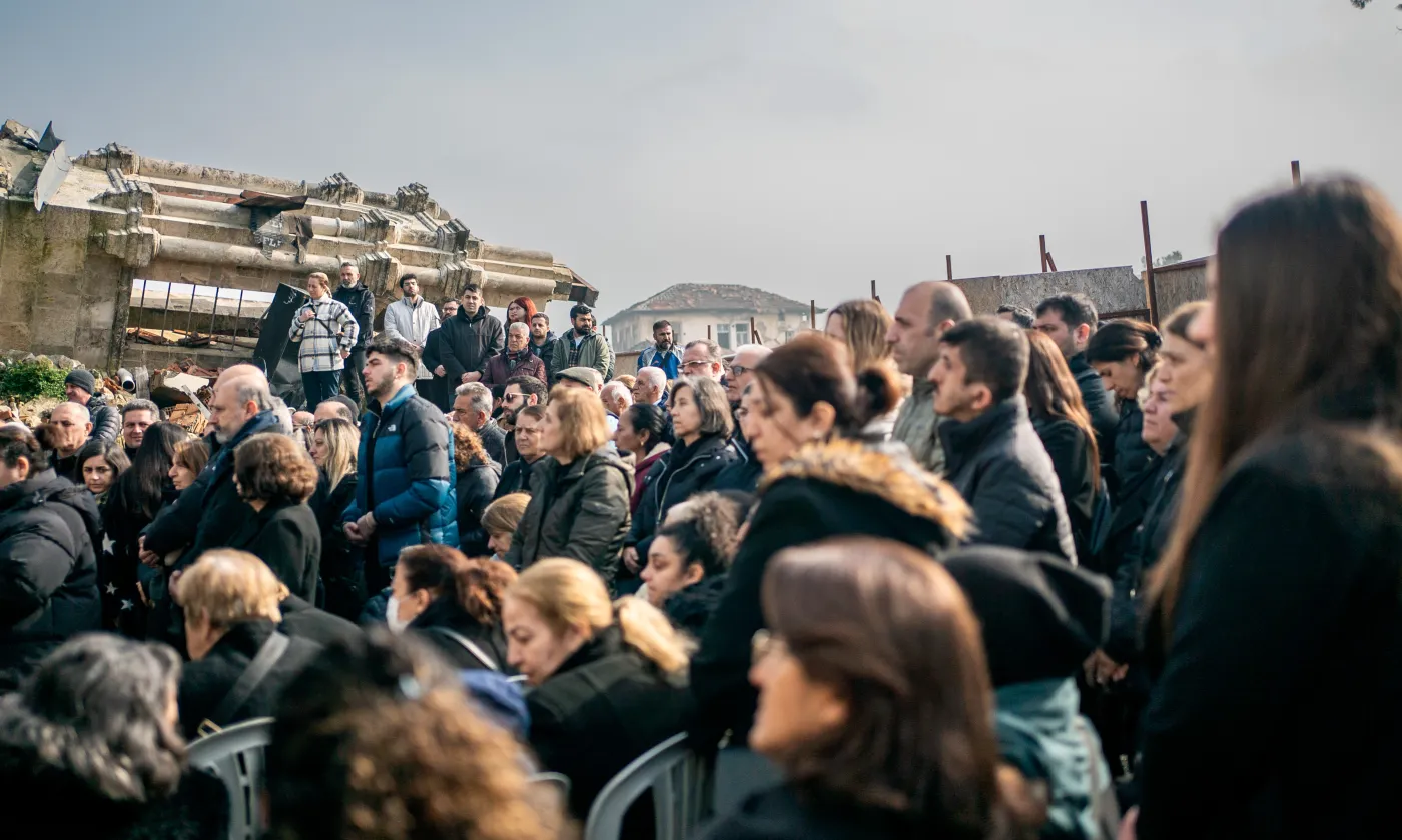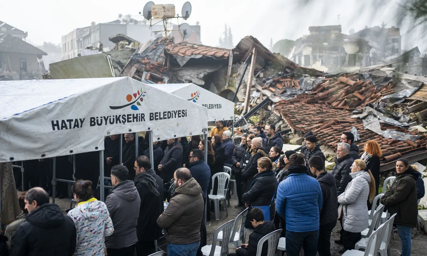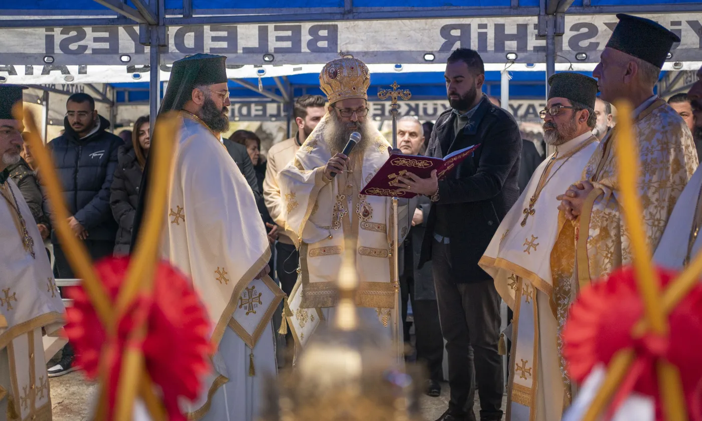 Le 6 février au matin, une messe commémorative a eu lieu à l'endroit où la rum ortodox kilisesi (église orthodoxe grecque) était construite et a été détruite pendant le séisme, à Antakya, en Turquie.