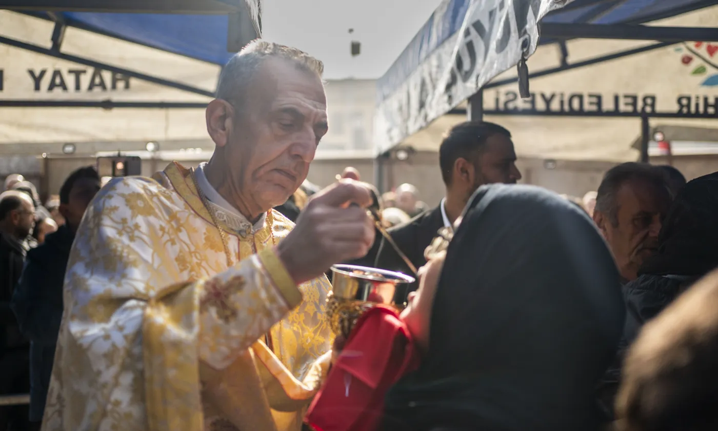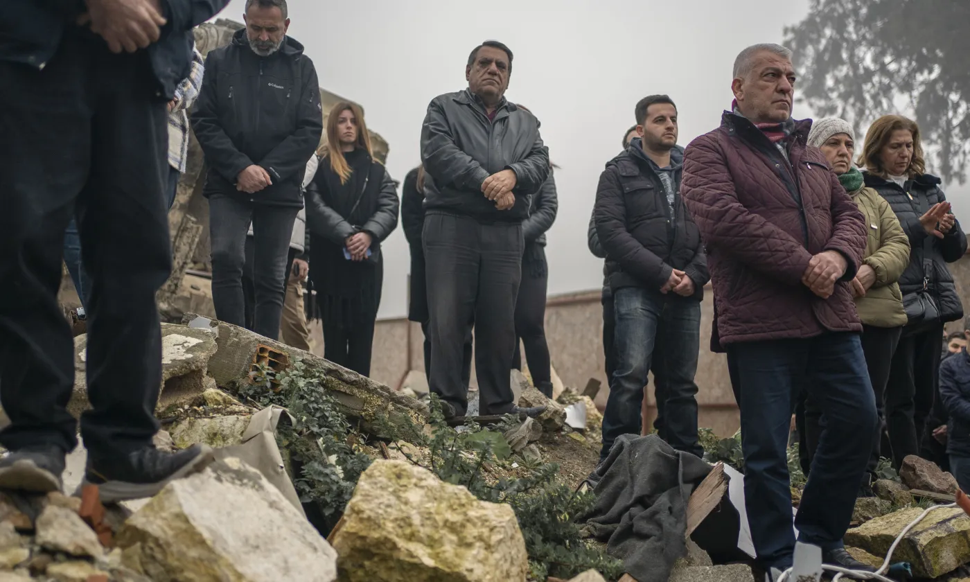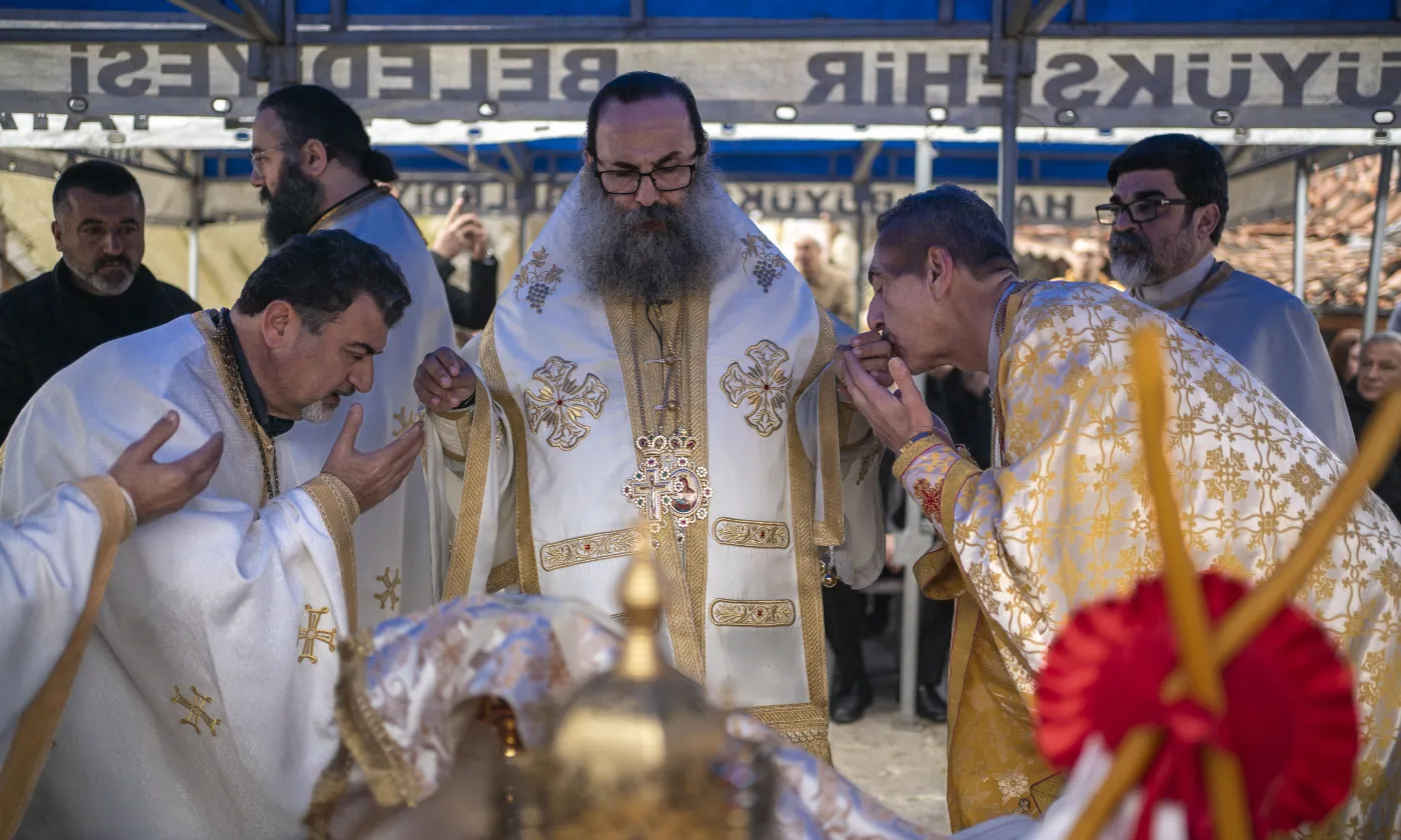 Le 6 février au matin, une messe commémorative a eu lieu à l'endroit où la rum ortodox kilisesi (église orthodoxe grecque) était construite et a été détruite pendant le séisme, à Antakya, en Turquie.