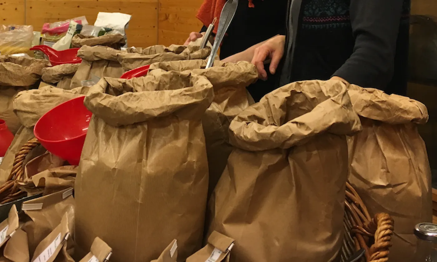 Le marché ne désemplit pas. Sur les tables, il y a pléthore de céréales: soja, épeautre, avoine, farine de blé et des noix, le tout vendu en vrac. Les acheteurs sont venus armés de sacs et de boîtes vides. La volonté est de réduire les déchets. Derrière les étals de fortune, affublés de tabliers, les bénévoles renseignent, servent, pèsent et encaissent, sans faire le moindre bénéfice.